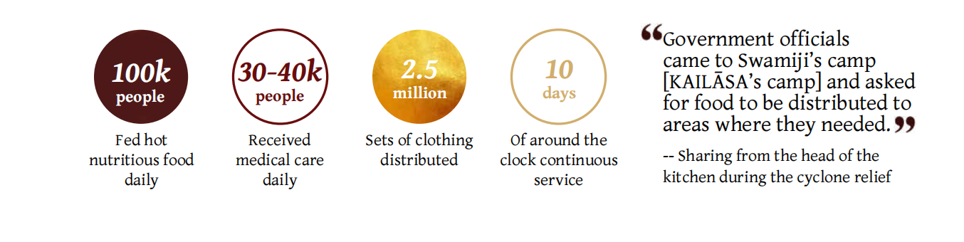 The short term focus was on providing hot nutritious food daily, where many people did not have the facilities to cook for themselves. A mega kitchen was set up in the disaster zone. Pondicherry government officials sought the help of KAILĀSA to expand the services to other affected zones. In response, KAILĀSA enlisted 25 trucks to deliver hot food to affected areas. The SPH personally oversaw that water tankers were also sent to villages without clean water supply.